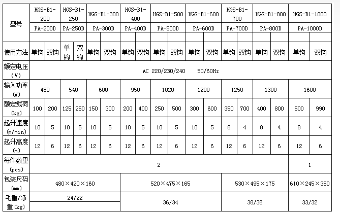 PA250D微型電動(dòng)葫蘆技術(shù)參數(shù)表: